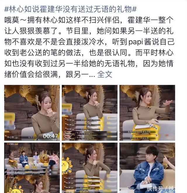 当papi酱分享自己收到老公送的笔的反应,林心如也会被维嘉问有没有相似经历。 林心如的回答当然也很符合大众标准,即她对另一半送的礼物给满情绪价值,不会做扫兴的伴侣。 这么一说,热搜马上就安排“林心如说霍建华没有送过无语的礼物”这样的词条。