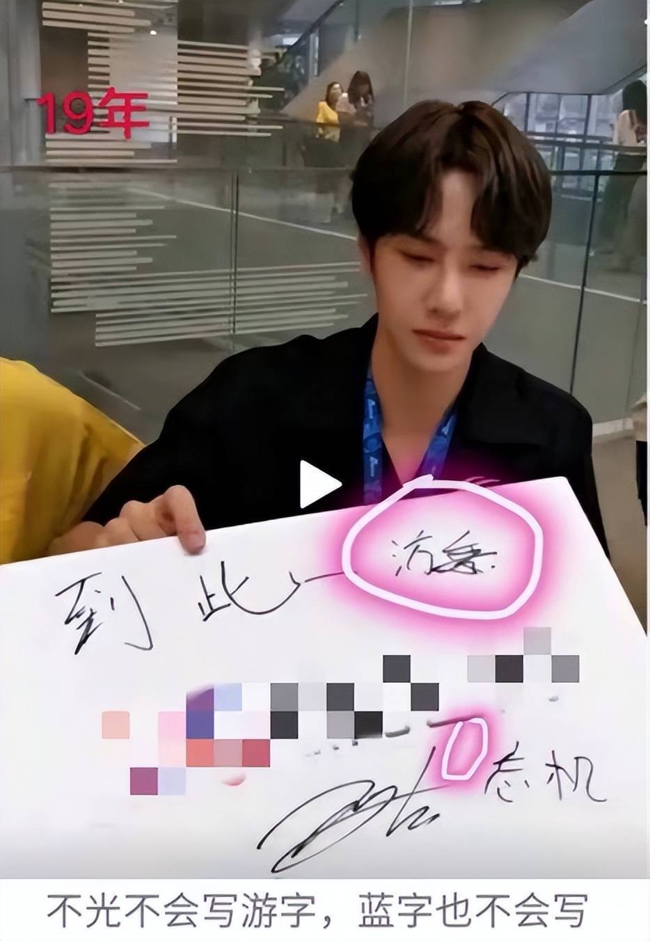 最经典的莫过于当年那场直播,王一博需要写下“蓝忘机到此一游”几个字。然而写到“此”字时,他突然卡壳,拿着笔愣在原地半天,最终纸板上“此”字位置空空如也,连“游”字都写错了。这一幕被网友截图疯传,尴尬程度让屏幕前的观众都忍不住替他抠出“三室一厅”。